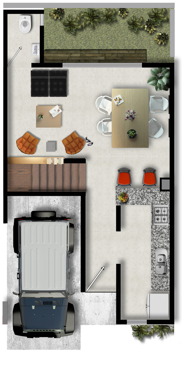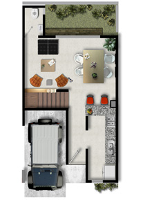 119.2 m2 + 19.35 m2, 2 recámaras, sala, comedor, 2.5 baños, cocina abierta, cuarto de TV y estudio, Roof Garden, jardín y estacionamiento.
