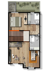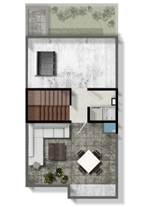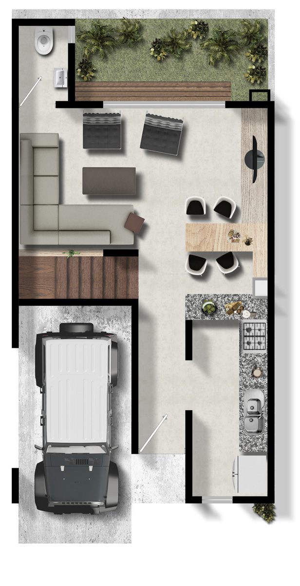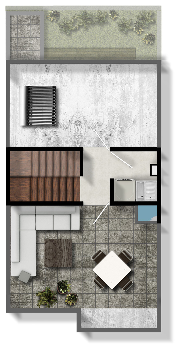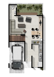 119.2 m2, 1 recámara, sala, comedor, 1 estudio, 2.5 baños, cocina abierta, Roof Garden, jardín y estacionamiento.