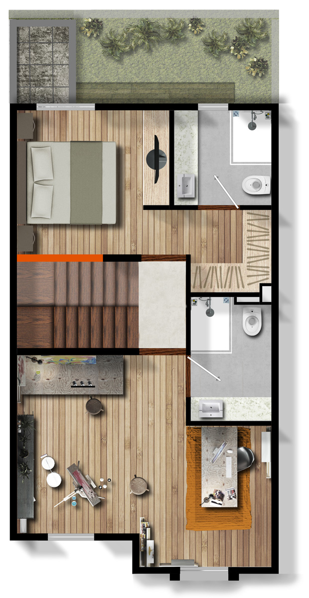 Trabaja desde casa en el taller de pintura que acondicionó en el segundo nivel. Es muy activo y le encanta organizar reuniones. Decidió hacer una sala grande con bar donde pasa la mayor parte de su tiempo pues cuando está solo lo usa como cuarto de tv, y con amigos los fines de semana juegan poker, ven los partidos de fútbol y aprovechan la terraza en la azotea para hacer asados.